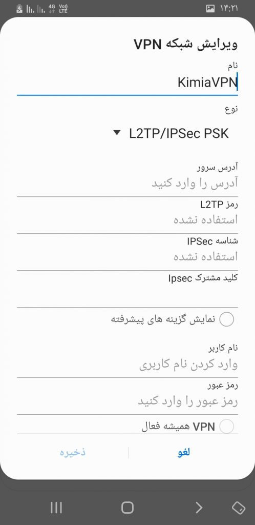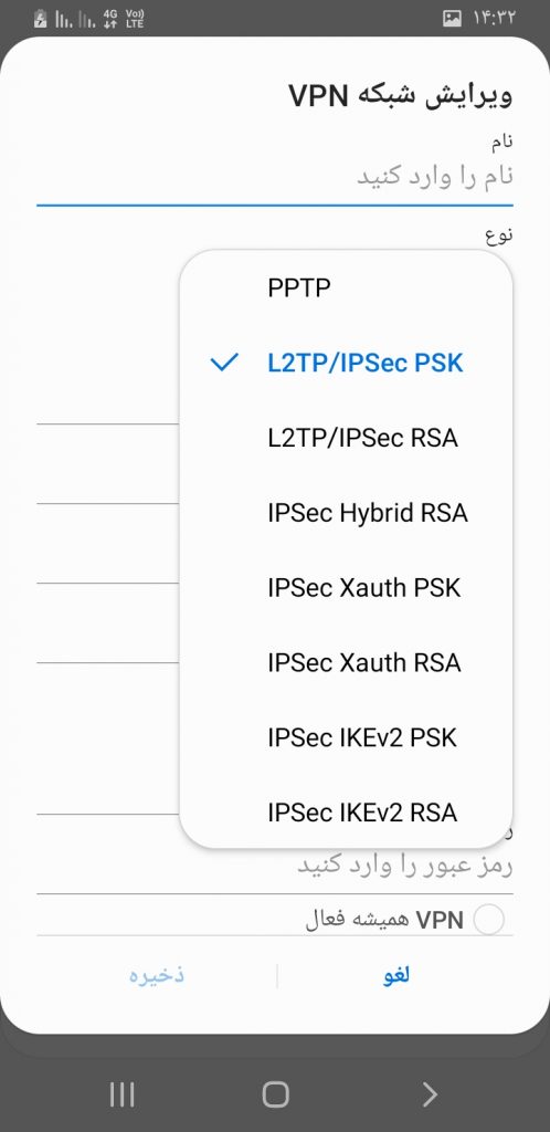 از میان گزینه ها, پروتکل L2TP/IPSec PSK رو انتخاب کنید