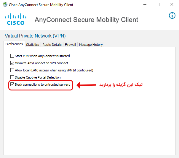 از بخش تنظیمات برنامه تیک این قسمت را بردارید و سپس پنجره را ببندید و مجدد کانکت کنید.