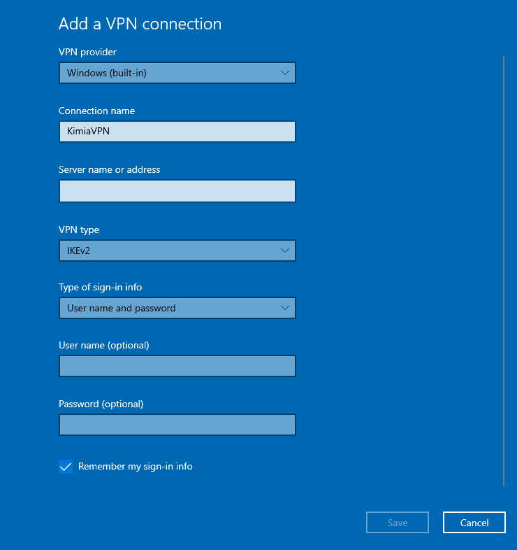 در این پنجره یک نام برای کانکشن وارد کنید و نوع پروتکل را نیز از لیست کشویی بر روی IKev2 تنظیم کنید. سپس از لیست سرور ها نیز سرور مورد نظر خود را وارد کنید. نام کاربری و رمز عبور خود را وارد کنید و در پایان اطلاعات را ذخیره/Save کنید.