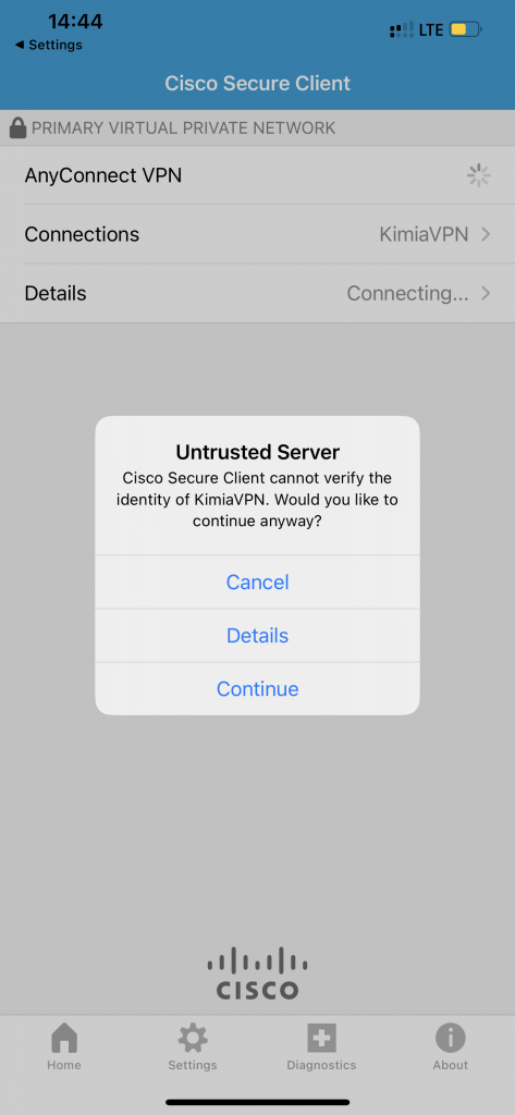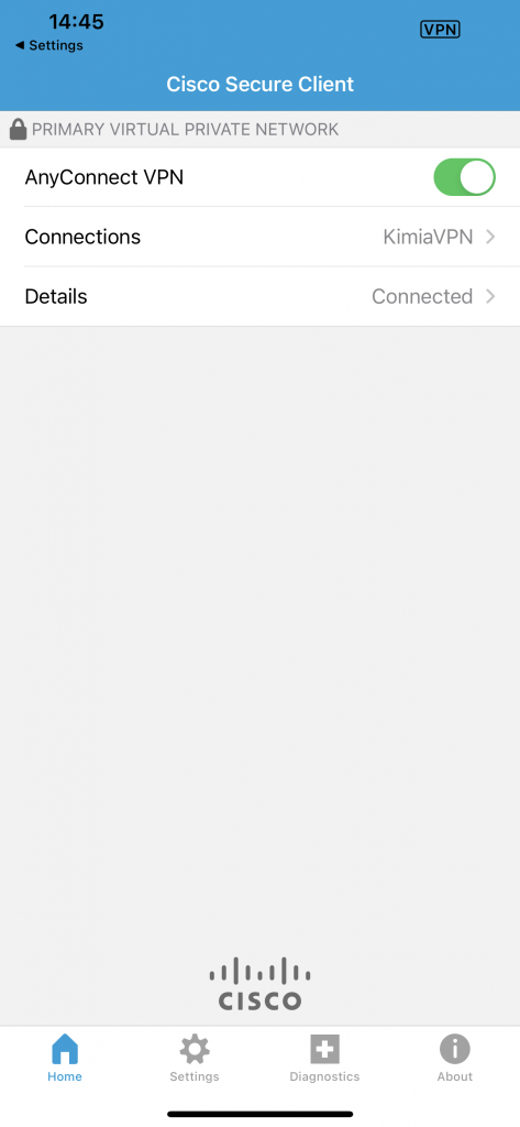 اگر مراحل را به درستی انجام داده باشید, اکنون همانند تصویر زیر شما به سرویس Cisco AnyConnect متصل می باشید.
